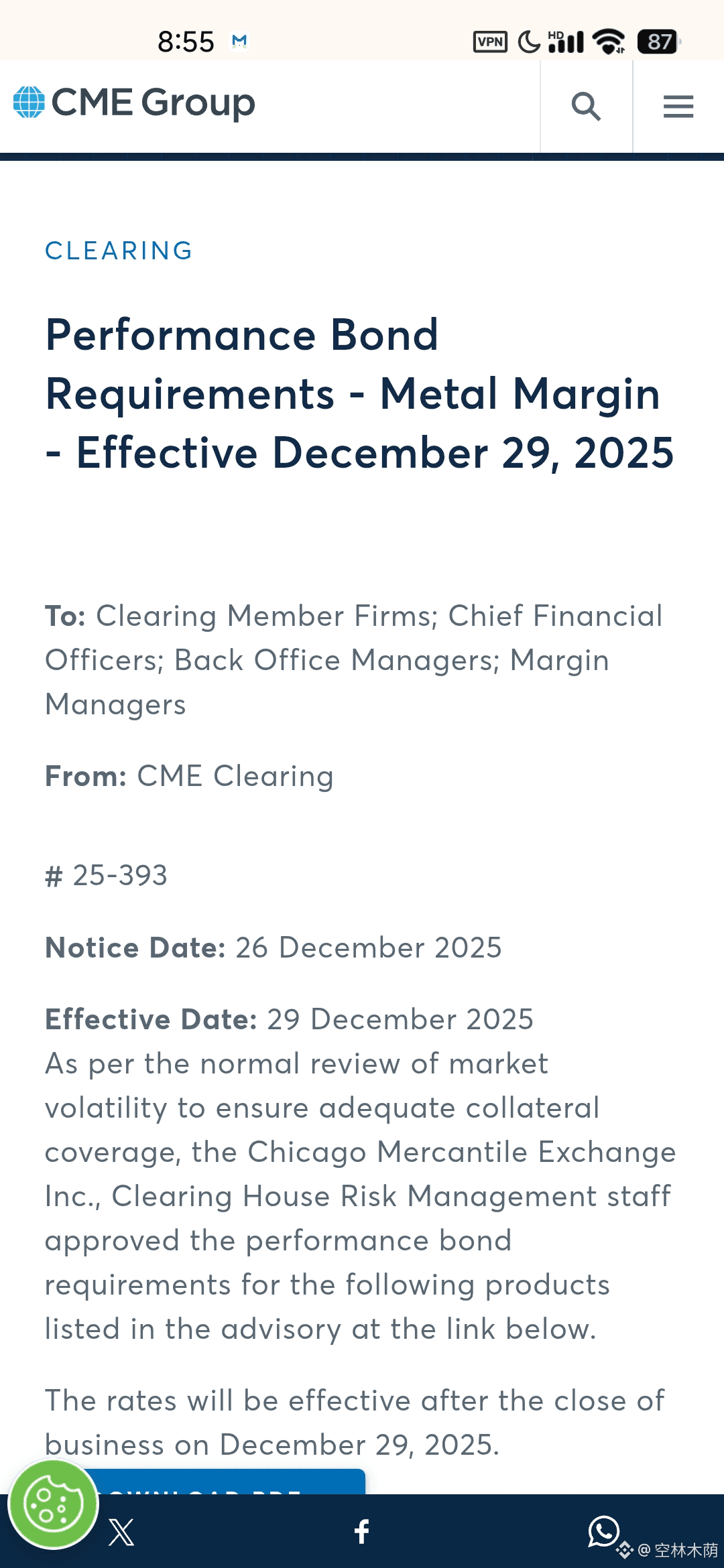 其次为保证金上调的“挤压”效应:去年底,芝商所便提高了期货保证金,面对白银的剧烈波动,交易所(CME)通常会大幅提高交易保证金。这对于杠杆极高的散户和部分机构来说,意味着必须补充资金或强制平仓,从而踩踏式地放大了跌幅。下图为去年芝商所提高金银期货保证金通知