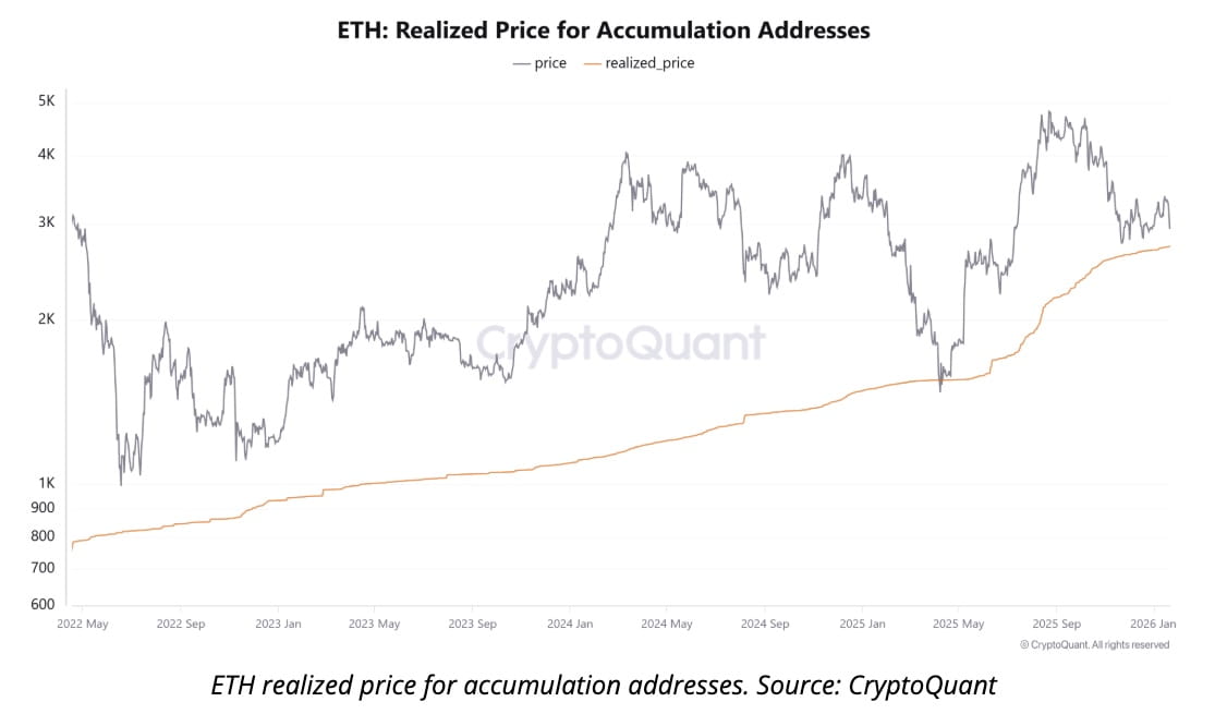 Według CryptoQuant, adresy akumulacji Ethereum — portfele, które konsekwentnie kupują bez dystrybucji — nadal zwiększają swoją zrealizowaną cenę, która obecnie wynosi około $2,720.