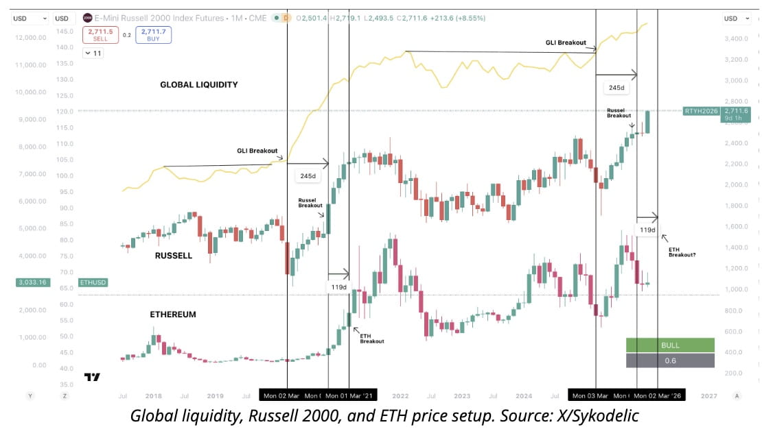 Analitycy twierdzą, że ustawienie — które wcześniej przyniosło 226% wzrost ETH — ponownie pojawia się w globalnych metrykach płynności, amerykańskich akcjach małych spółek oraz strukturze cenowej Ethereum, zwiększając oczekiwania na potencjalny wielomiesięczny ruch w górę.