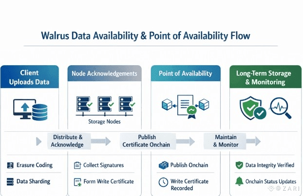 The true killer feature of Walrus is a concept known as the Point of Availability. In the legacy world there is a trust gap between the moment you hit upload and the moment the server confirms it is safe. In decentralized systems this gap can be even wider and more dangerous. Walrus closes this gap through a rigorous three step lifecycle starting with the submission where a writer sends their data to the network. This is followed by certification where the storage nodes provide signed acknowledgments which are combined into a write certificate. Finally there is the milestone where the certificate is published on chain.