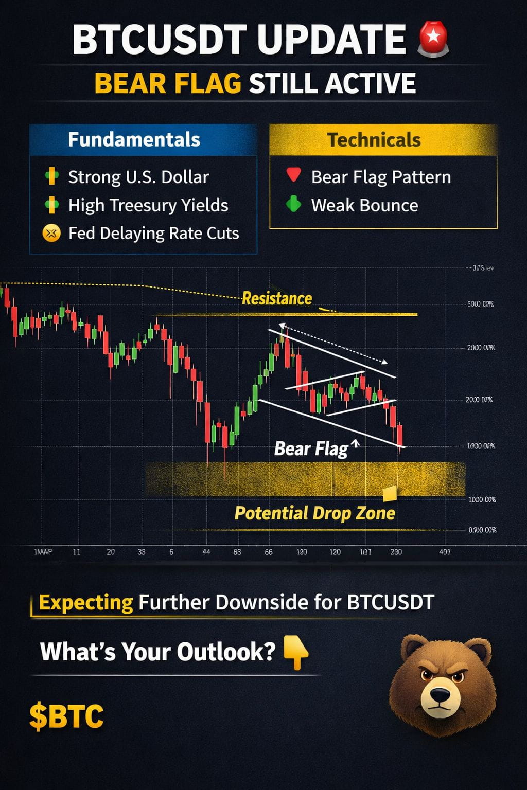 Po silnej wyprzedaży, $BTC miał tylko słabe odbicie, tworząc wzór Bear Flag na wyższych ramach czasowych. To klasyczny setup kontynuacji. Dopóki cena będzie odrzucana od górnej granicy flagi, sprzedawcy pozostaną u władzy, zwiększając szanse na ruch w kierunku stref o niższej płynności.