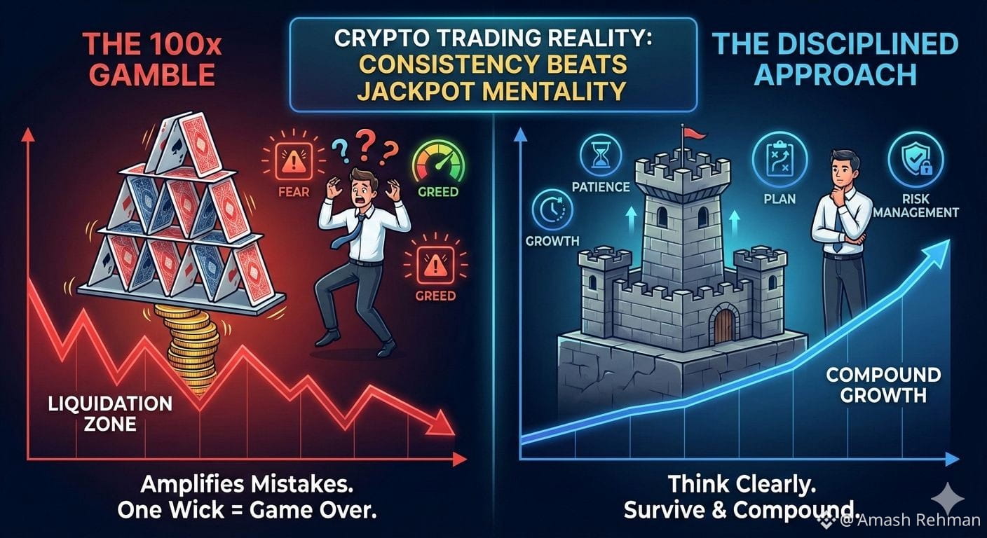 In crypto, leverage is often sold as a shortcut to success. Screenshots of massive gains, “one trade means life changed,” and the myth that higher leverage means higher skill flood social media.