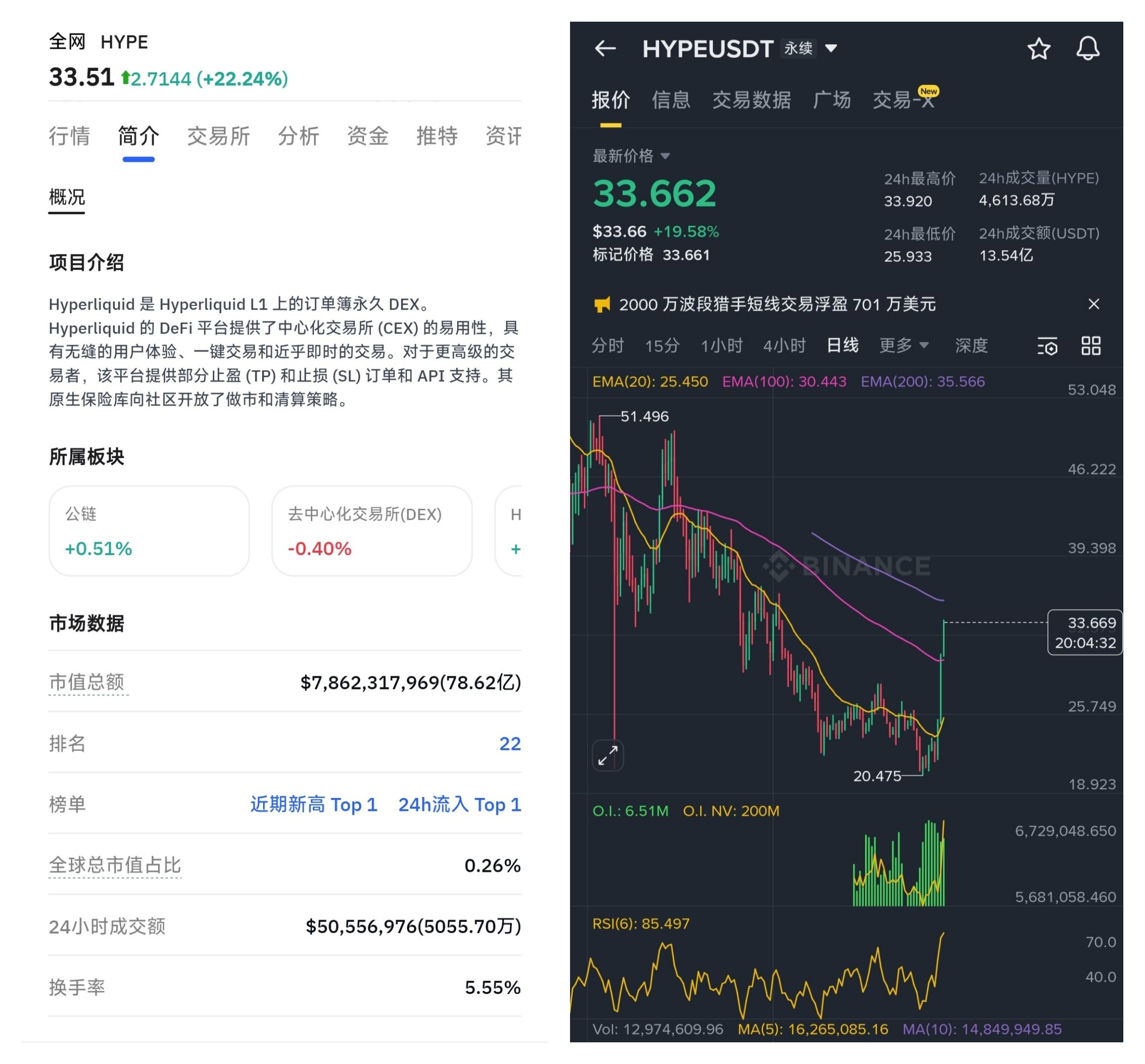 过去三天,$HYPE 代币价格从约20美元一路飙升至33美元附近,累计涨幅逼近50%,24小时单日涨幅一度高达27%。对于一个市值早已超过数十亿美元的成熟项目而言,这种级别的爆发性上涨极为罕见。