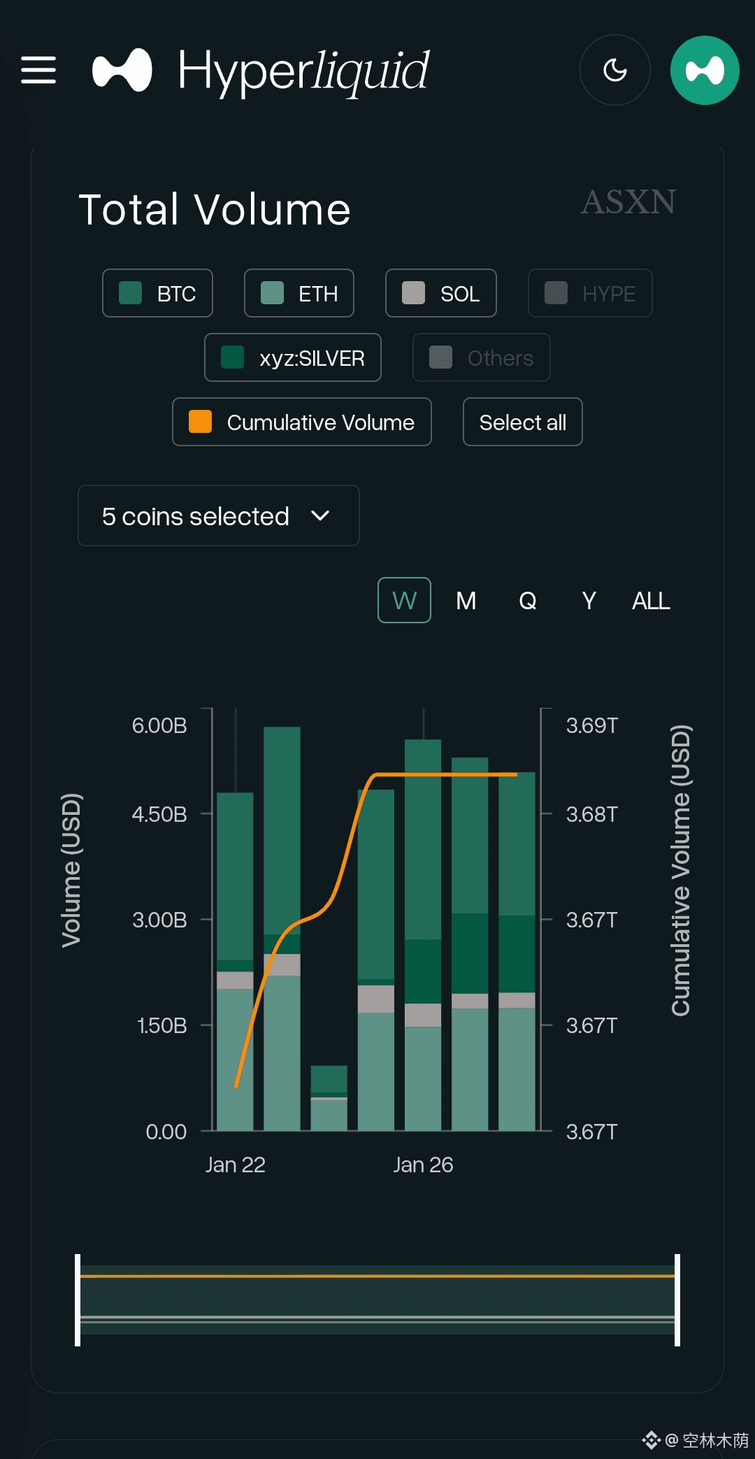 数据最能说明问题。在1月27-28日的高峰期,Hyperliquid平台241. 24h总交易量达到30-35亿美元,其中商品合约贡献了惊人的40-50%以上:白银(XAG)单资产交易量高达10-12.5亿美元,稳居平台第三,仅次于BTC和ETH,甚至超越SOL、XRP等主流加密资产。