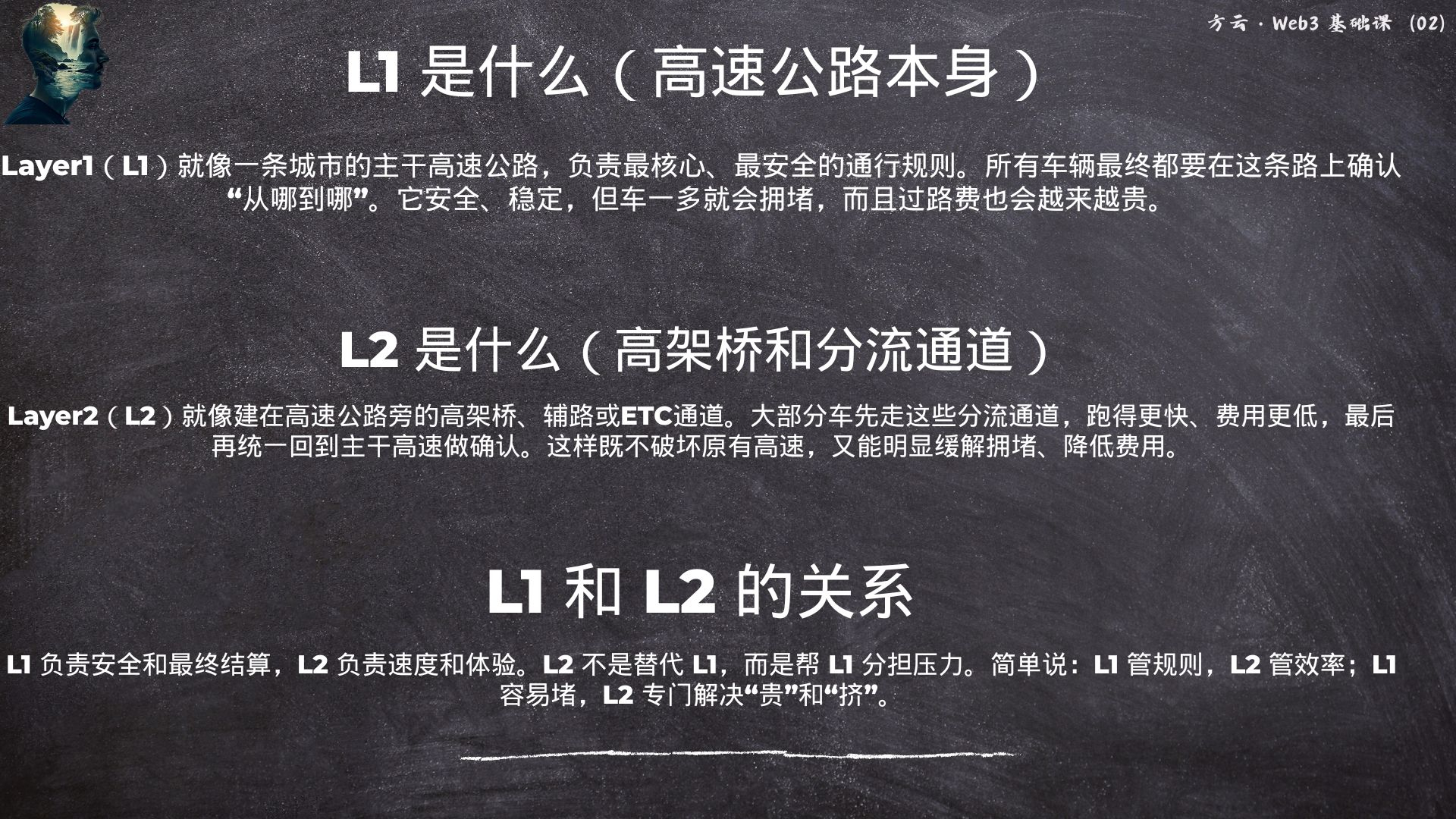 Layer1(L1) jest jak główna autostrada w mieście, odpowiedzialna za najważniejsze i najbezpieczniejsze zasady ruchu. Wszystkie pojazdy muszą ostatecznie potwierdzić „skąd dokąd” na tej drodze. Jest bezpieczna, stabilna, ale gdy jest zbyt dużo samochodów, dochodzi do zatorów, a opłaty drogowe stają się coraz droższe.
