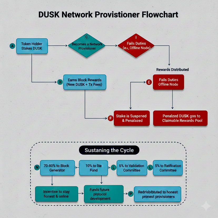 Aby zrozumieć, jak stakowanie i zachęty współpracują, aby zabezpieczyć sieć DUSK, oto uproszczony widok procesu: