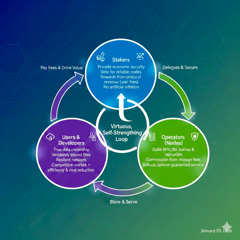 To tworzy potężną dynamikę: gdy Walrus rośnie, stakerzy przejmują więcej wartości z rosnącej bazy przychodowej. Ponadto model ma wbudowaną pętlę zwrotną dla korzyści użytkowników. Gdy skala przynosi efektywności, mechanizmy rynkowe zachęcają sieć do przekazywania oszczędności użytkownikom poprzez niższe ceny przechowywania. To nie jest altruizm; to inteligentny rozwój. Tańsze przechowywanie przyciąga więcej użytkowników, co dalej zwiększa przychody i bezpieczeństwo sieci - napędzając koło zamachowe.