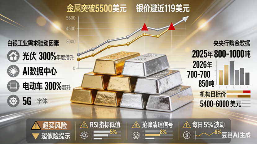 Cena złota przekroczyła już 5500 dolarów, srebro zbliża się do 119 dolarów, obie osiągnęły nowe historyczne szczyty, a wzrosty złota i srebra wciąż trwają, ale emocje na rynku wyraźnie się podzieliły: z jednej strony FOMO, a z drugiej obawy przed zablokowaniem.