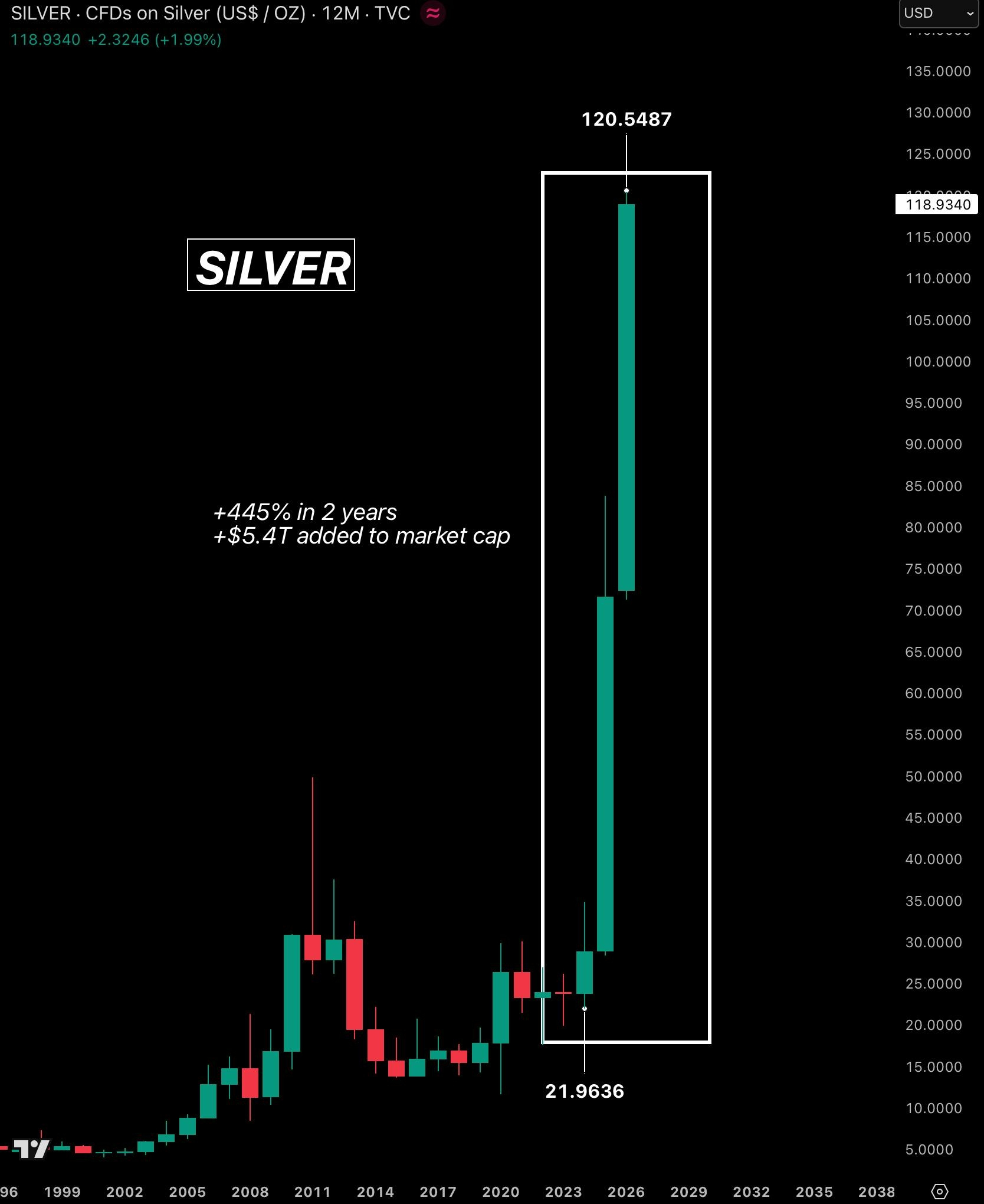 Metal właśnie wzrósł do 120 dolarów, wzrastając o ponad 450% w zaledwie dwa lata, dodając ponad 6 bilionów do swojej całkowitej wartości rynkowej — oficjalnie stając się najlepiej radzącym sobie głównym aktywem na planecie.