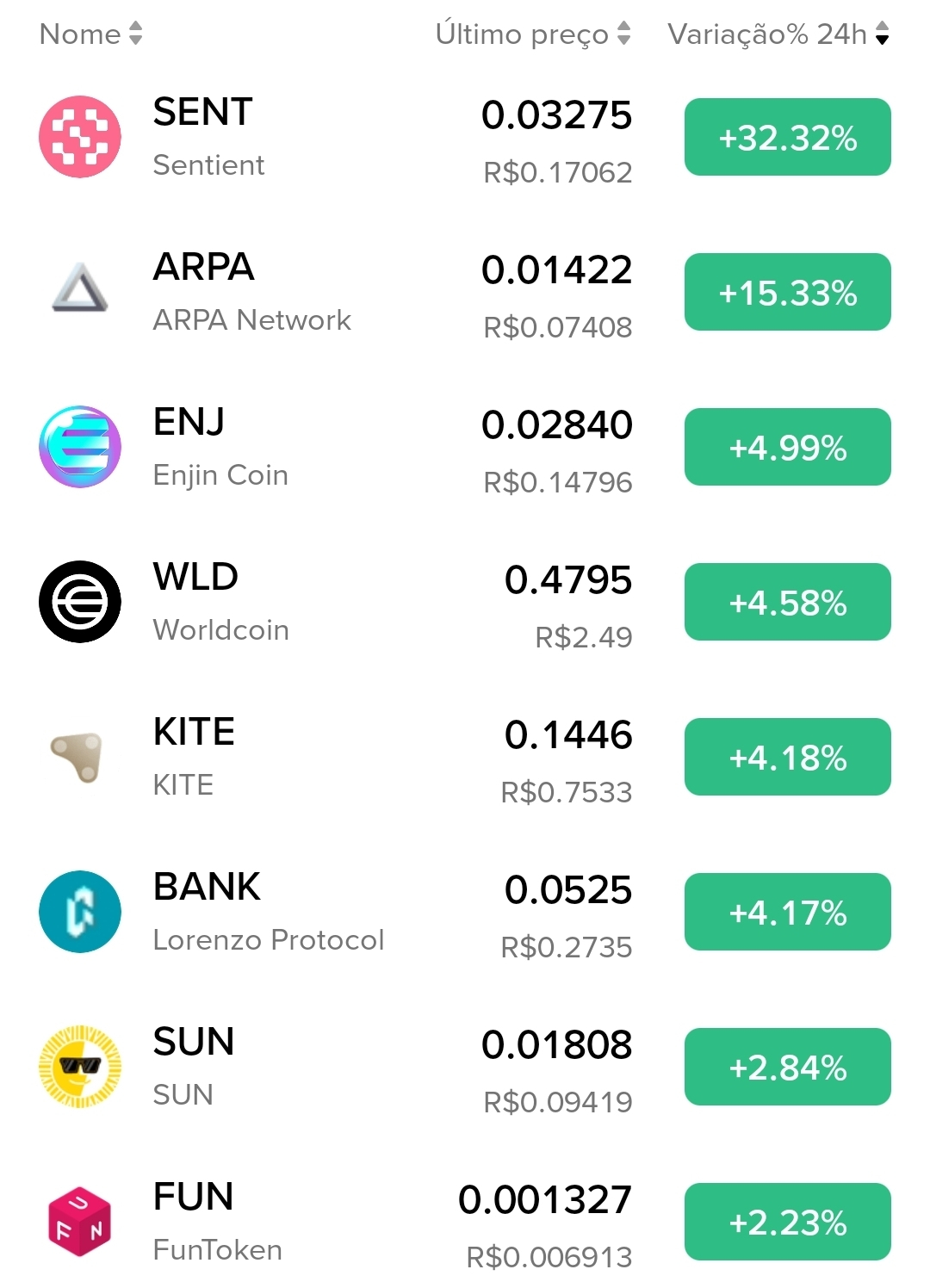 SENT +32% prowadzi (silny przepływ spekulacyjny).ARPA +15% potwierdza przełamanie.ENJ, WLD i KITE kontynuują rotację kapitału.Trend: selektywny przepływ pieniędzy w small caps.