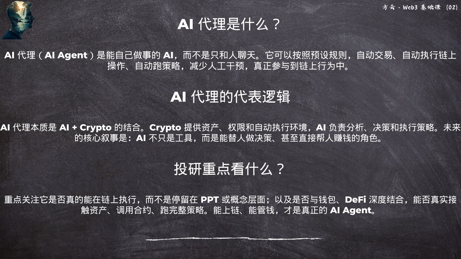 Istota AI agenta to połączenie AI i Crypto. Crypto zapewnia aktywa, uprawnienia i środowisko do automatycznego wykonania, a AI odpowiada za analizę, podejmowanie decyzji i wykonywanie strategii. Kluczowym narracją w przyszłości jest to, że AI to nie tylko narzędzie, ale także rola, która może podejmować decyzje za ludzi, a nawet bezpośrednio pomagać w zarabianiu pieniędzy.
