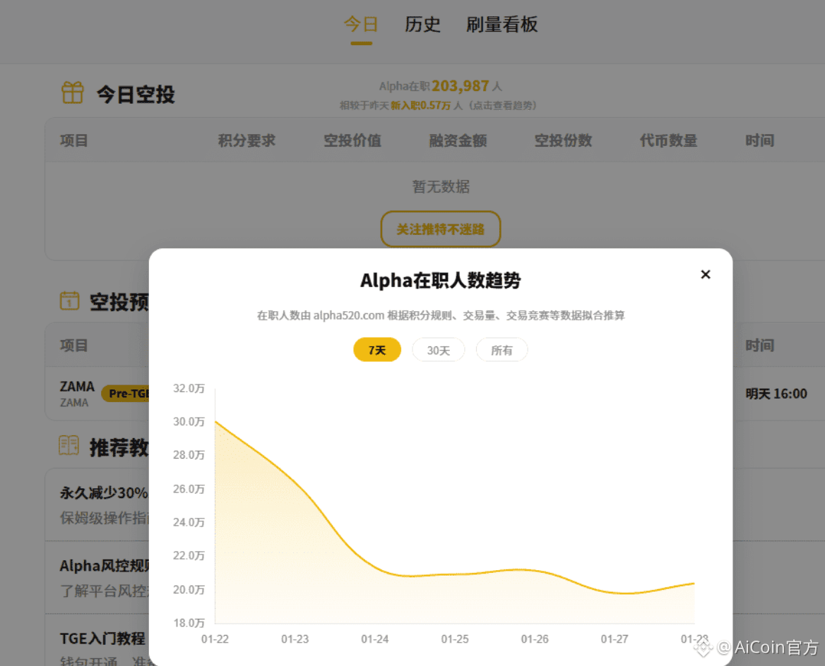 给大家同步个好信号:最近刷 Alpha 的人数慢慢下降了,这可是好事!人少竞争小,咱们攒分拿空投的概率更高,主播看到大家的问题都会回复,放心跟着节奏来
