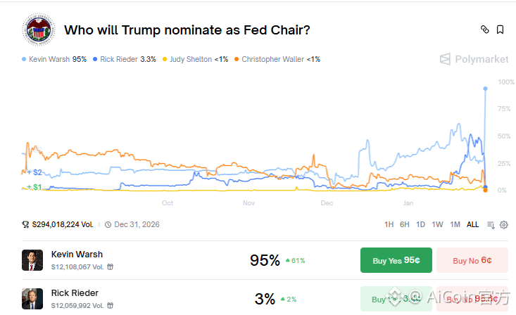 几乎同一时间,多个信源与预测市场的数据将焦点锁定在同一个人身上:前美联储理事凯文·沃什(Kevin Warsh)。预测市场Polymarket显示,沃什获得提名的概率已飙升至95%。