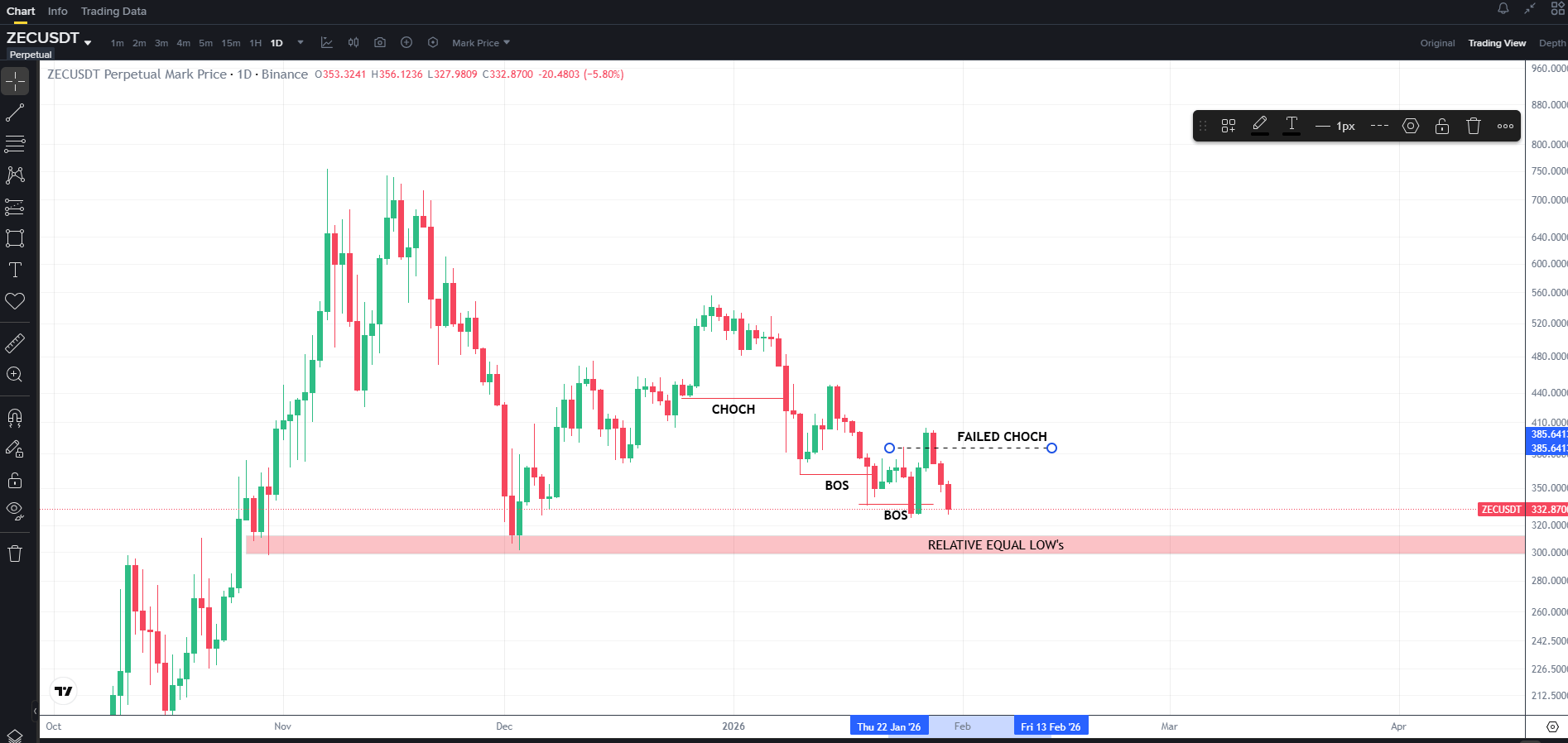 Na dziennym interwale czasowym możemy zobaczyć, że cena pięknie stworzyła niedźwiedzi momentum, jak narysowałem na wykresie. Możemy zobaczyć, że poniżej są względne równe dołki. Cena musi je złamać, ponieważ tam spoczywa płynność. Cena musi więc najpierw dotrzeć do tej strefy. Potem może nastąpić odwrócenie lub nie. Ale do tego czasu musimy pozostać przy krótkiej pozycji. Wchodzenie w długą pozycję będzie błędną decyzją.