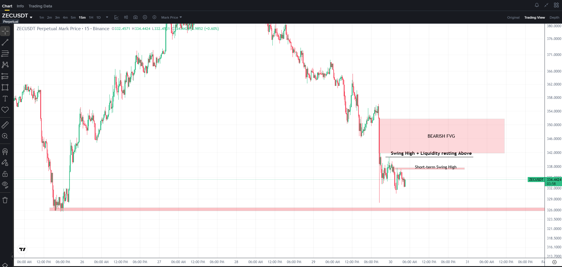 Oczekuję, że ten swing high powinien zostać najpierw złamany, aby przejść w dół. Możemy również zobaczyć niedźwiedzi FVG w górnej części wykresu, o którym wspomniałem. Możemy zatem spodziewać się nagłego ruchu byka, a to będzie pułapka, ponieważ wielu detalistów pomyśli, że cena pójdzie w górę lub odbije się. Ale tak naprawdę po prostu zgarniemy płynność z góry, a potem spadnie. Musimy więc mieć cierpliwość i nie ma potrzeby panikować. Więc kiedy zobaczymy płynność, tylko wtedy wejdziemy po potwierdzeniu z niższego interwału czasowego.
