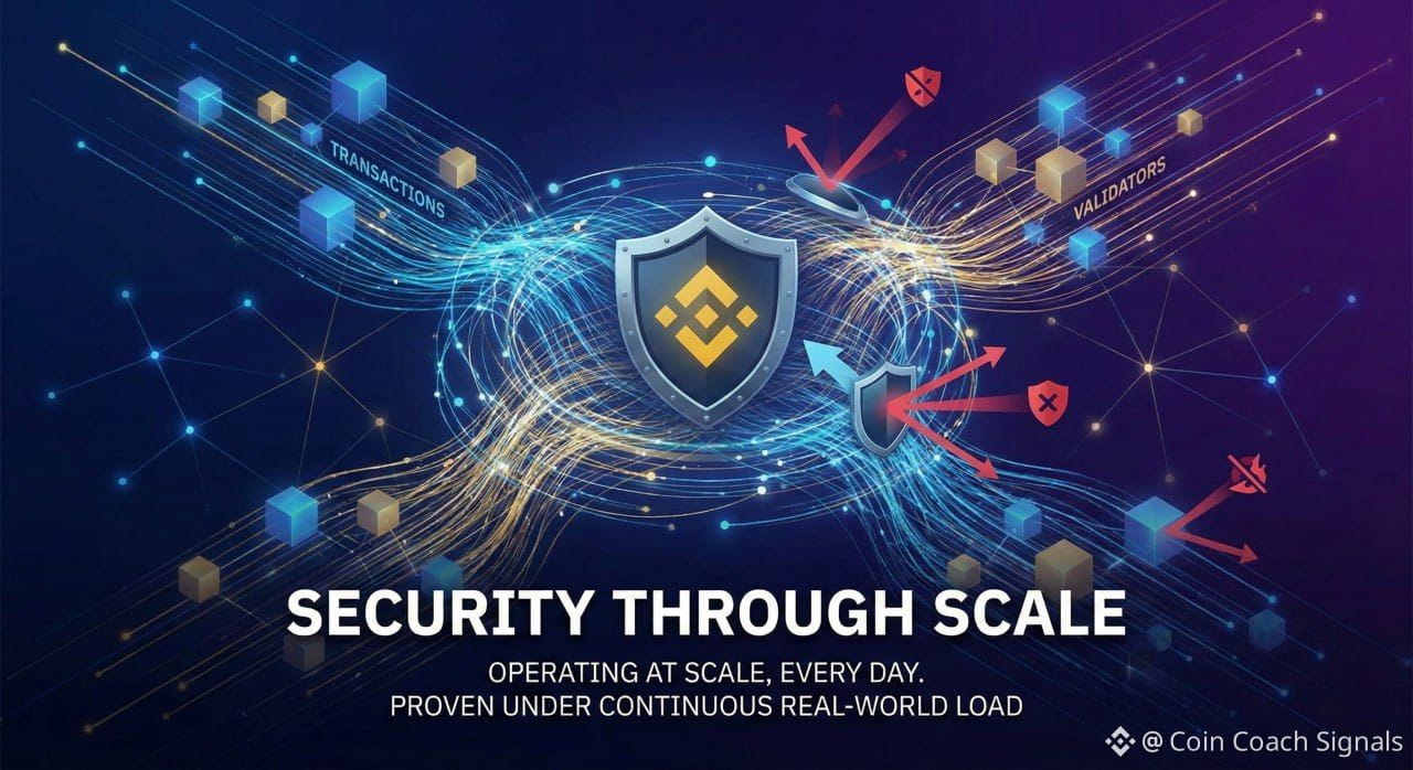 BNB also benefits from something many networks only promise: operating at scale, every single day. High throughput combined with an established validator structure makes the network hard to disrupt and expensive to attack.