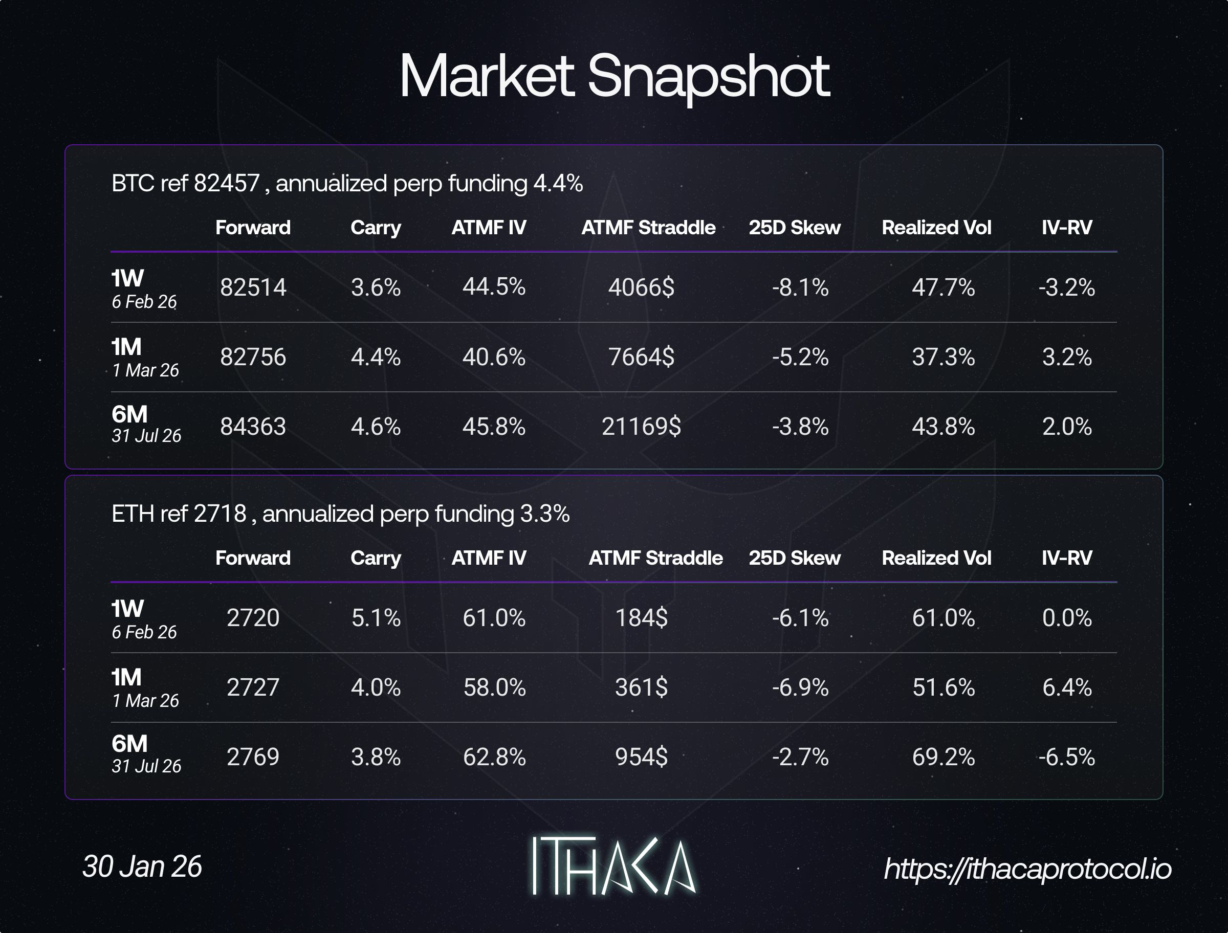 ETH utrzymuje silniejszy carry na krótkim końcu, ale skew jest bardziej negatywny niż BTC, co sugeruje większe zabezpieczenie przed spadkiem. Długoterminowa IV pozostaje podwyższona, więc rynek wycenia większe ruchy w przyszłości pomimo stabilizacji w krótkim okresie.