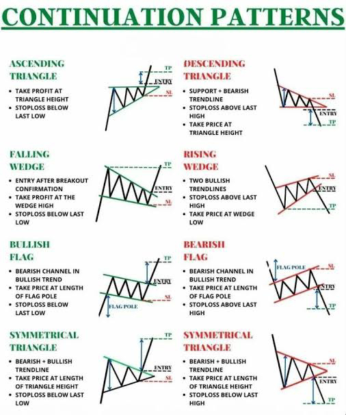 Trójkąty i flagi: To są wzorce "kontynuacji". Jak sprężyna, Wznoszący się Trójkąt lub Flaga Bycza pokazują rynek robiący oddech przed następnym ruchem w górę.