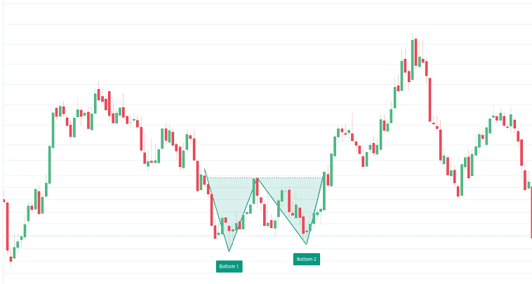 Wzór "W" (podwójne dno): Klasyczny wzór odwrócenia. Pokazuje rynek broniący konkretnego poziomu cenowego dwukrotnie przed mocnym wybiciem.