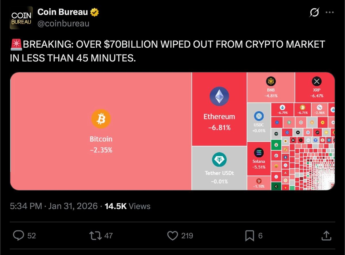 W mniej niż 45 minut rynek kryptowalut zobaczył nagłą falę sprzedaży, która zatarła ponad $70 miliardów w całkowitej wartości rynkowej, podkreślając, jak krucha pozostaje płynność w okresach zwiększonej dźwigni. Bitcoin spadł o około 2.35%, utrzymując się relatywnie lepiej niż szerszy rynek, podczas gdy Ethereum spadło o około 6.81%, a Solana o około 5.51%. Szybkie, zsynchronizowane zjawisko spadków wśród głównych kryptowalut wskazuje na kolejną falę sprzedaży napędzanej likwidacjami, a nie zmianą fundamentów, wzmacniając pogląd, że ruchy cenowe wciąż są dyktowane przez dźwignię i cienkie książki zamówień, a nie długoterminowe przekonania.