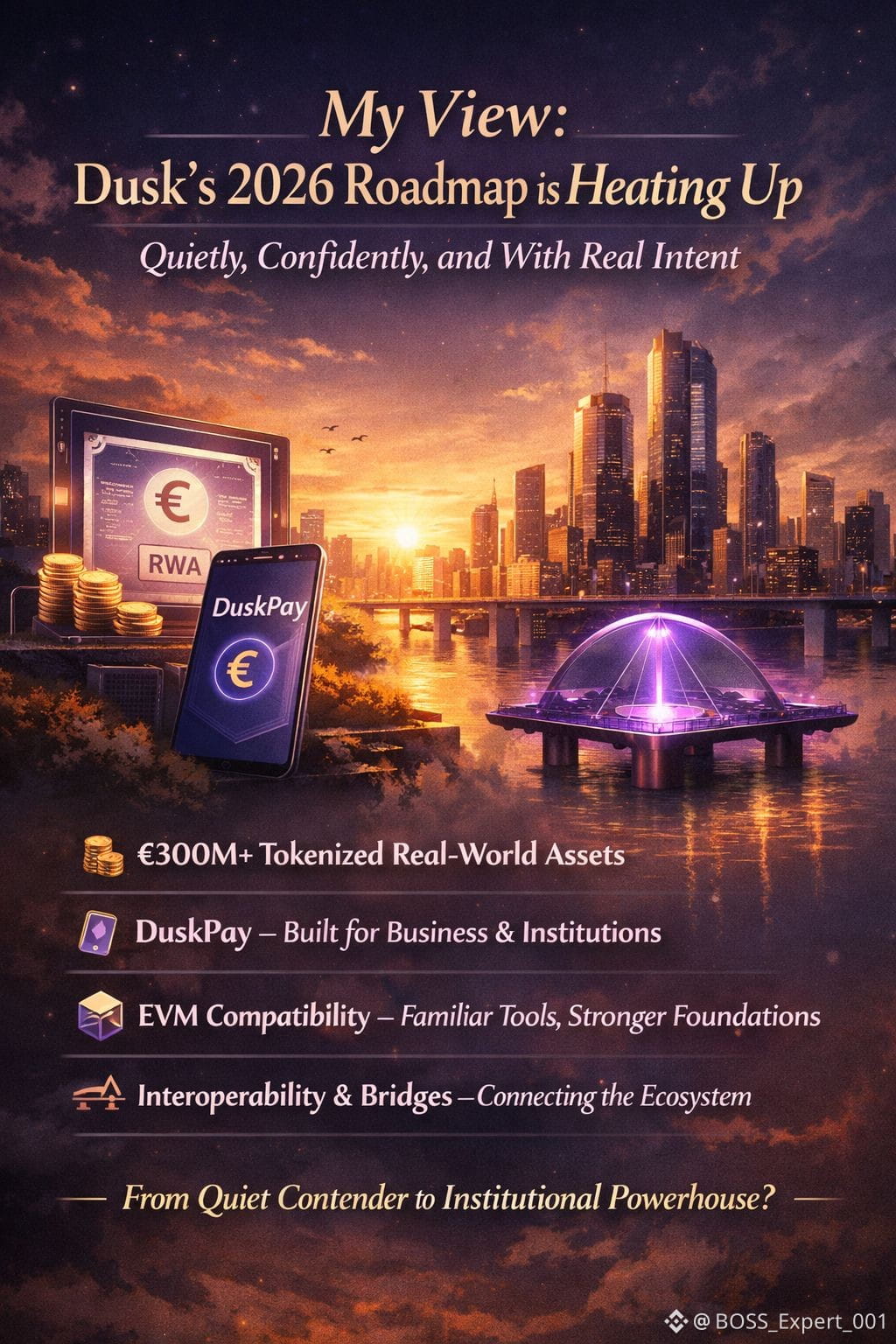 What matters more is direction — and Dusk’s direction is clear.Risks Exist — But They’re the Right Kind,Execution timelines. Regulatory approvals. Institutional onboarding.These aren’t weaknesses — they’re the challenges of building something real. Dusk isn’t fighting imaginary problems. It’s navigating real ones.Final Thought: Why Dusk Feels Different,Dusk doesn’t feel rushed.It feels deliberate.If even part of the 2026 roadmap lands as expected — DuskEVM adoption, meaningful RWA issuance, DuskPay in action — Dusk won’t need hype to justify its place in the market.It will simply be there, doing the work.And in crypto, that’s often how the most important networks are built.#dusk @Dusk $DUSK