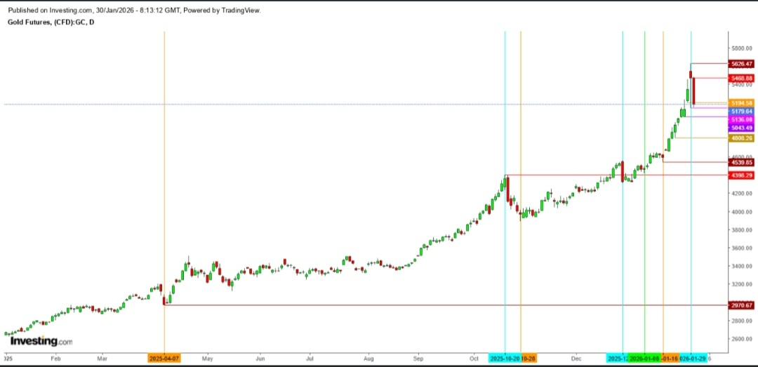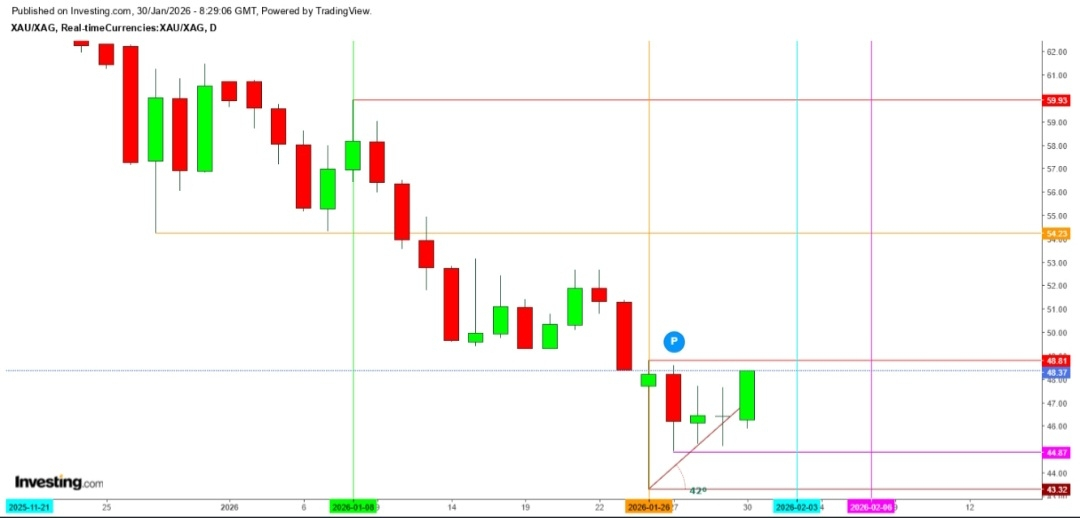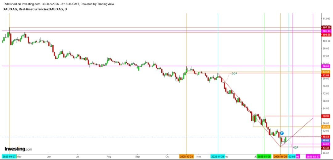 Piąta ważna data, którą należy zauważyć, to 1 stycznia 2026 roku, kiedy to XAU/XAG testował najniższy poziom na 43,32, podczas gdy kontrakty terminowe na złoto testowały rekordowy szczyt na 5626,47 USD, a kontrakty terminowe na srebro również testowały rekordowy szczyt na 121,746 USD 29 stycznia 2026 roku.
