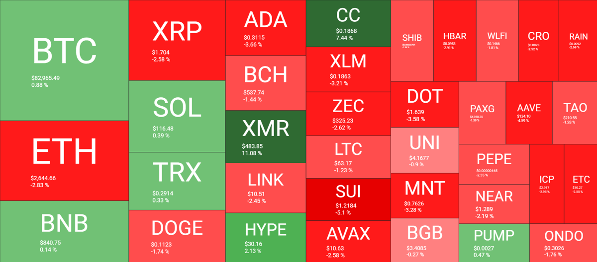 Większość z 36 najlepszych altcoinów niebędących stablecoinami jest dzisiaj na czerwono. Ethereum zmaga się poniżej $2,650 po kolejnym spadku o 3% dziennie. XRP spadł do $1.70 po spadku o 2.5%. ADA, DOGE, LINK, BCH, XLM, ZEC i AVAX również są na czerwono o maksymalnie 4%, podczas gdy SUI spadł o ponad 5%.