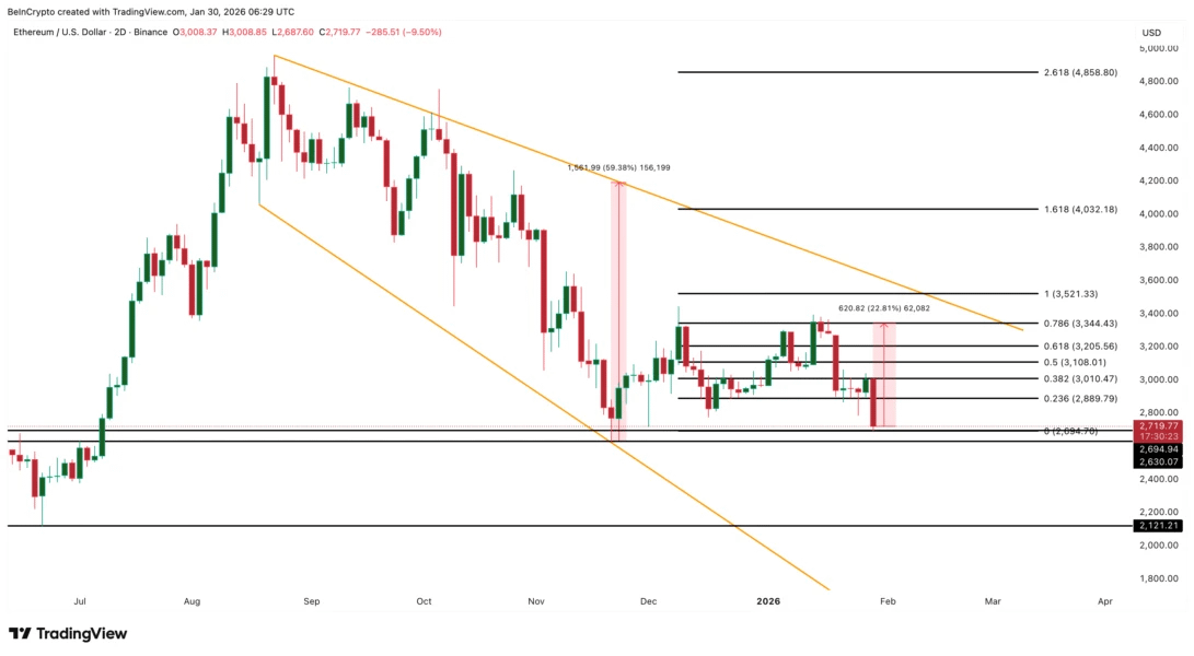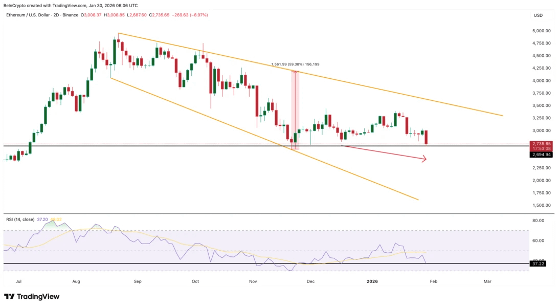 Na dwudniowym wykresie notowania Ethereum pozostają w ramach figury „opadający klin”. Model ten formuje się przy kolejnych spadkach maksimów i minimów. Często wskazuje na osłabienie presji ze strony sprzedawców. Potwierdzony wyjście z tej figury może prowadzić do znacznego wzrostu, chociaż obecna zmienność zachowuje ryzyko.
