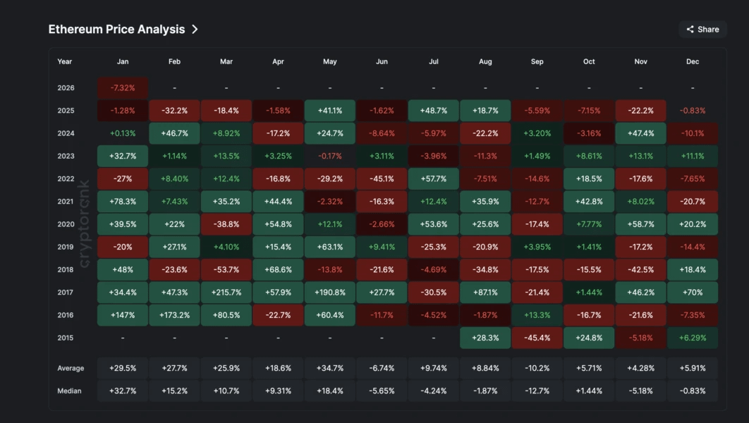 $ETH wchodzi w luty 2026 roku w stanie niepewności. Po spadku wartości prawie o 7% w styczniu aktyw demonstruje dynamikę, różniącą się od historycznych wskaźników. Zwykle medianowy zwrot w pierwszym miesiącu roku wynosi około +32%, jednak obecny okres stał się wyjątkiem. Luty tradycyjnie uważany jest za bardziej umiarkowany miesiąc z medianowym wzrostem o 15% od 2016 roku.