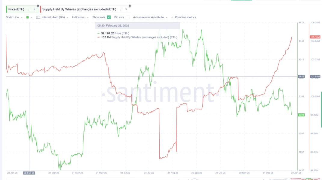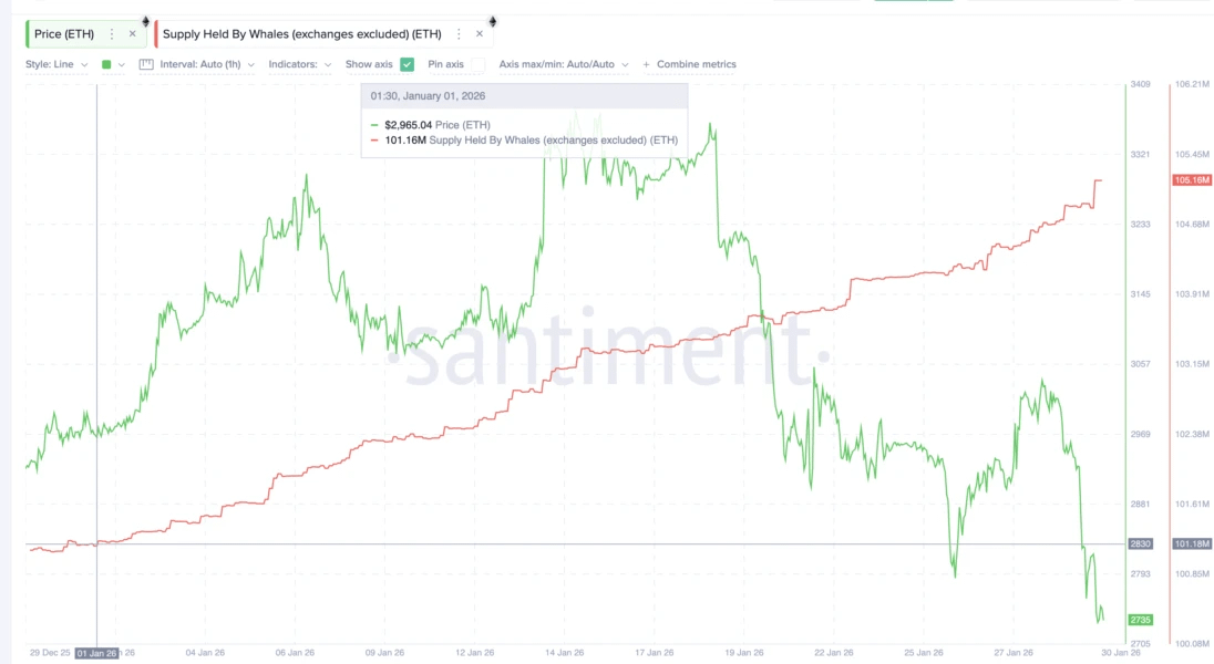 Duzi inwestorzy, często nazywani „wielorybami”, dają bardziej pozytywny sygnał. Od początku stycznia wolumen Ethereum na ich saldach wzrósł z 101,18 mln do 105,16 mln monet. Zakup aktywu podczas korekty cenowej podkreśla długoterminowe zainteresowanie ze strony dużego kapitału.