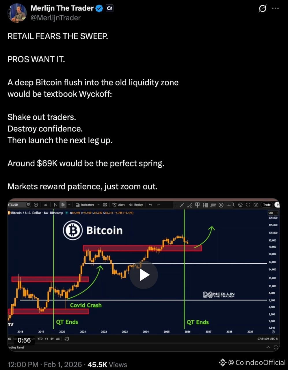 According to Merlijn The Trader, the latest decline fits a classic Wyckoff-style “spring” scenario. He argues that retail traders tend to fear sharp downside moves, while more experienced participants look for deep liquidity sweeps into prior demand zones. In his view, a flush into older liquidity pockets is designed to force traders out of positions, damage sentiment, and reset positioning before a new upward leg forms.