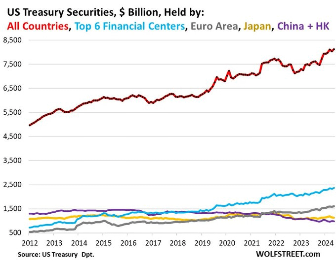 Zagraniczni inwestorzy wciąż trzymają ~$8,2T w obligacjach skarbowych USA (~33% w obiegu).