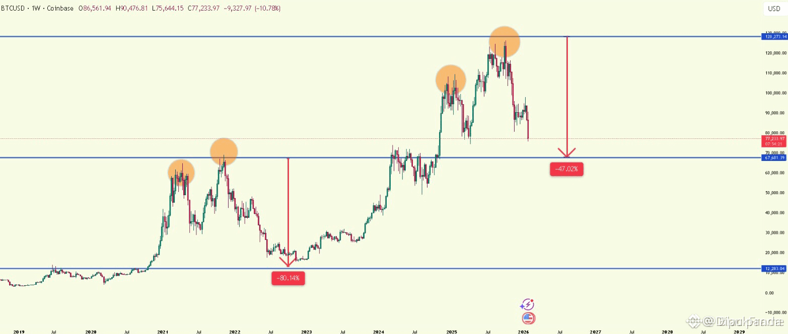 Honestly, Bitcoin's trajectory is eerily similar to the 2021 scenario. Back then, it peaked around $69K, created a double top pattern (which basically means price goes up, hits the same level twice, then fails), and the price ended up dropping a ton, like 80% down, all the way to $15K.