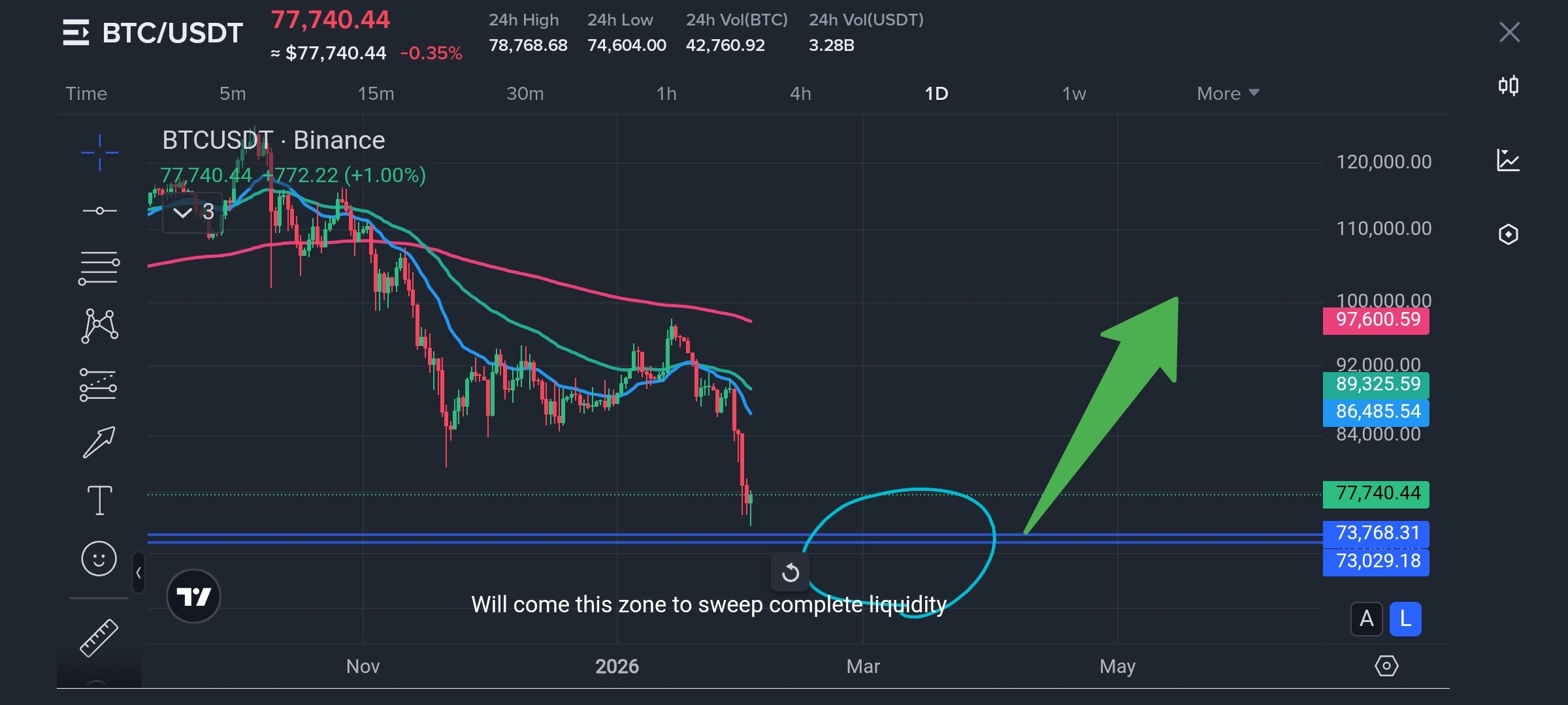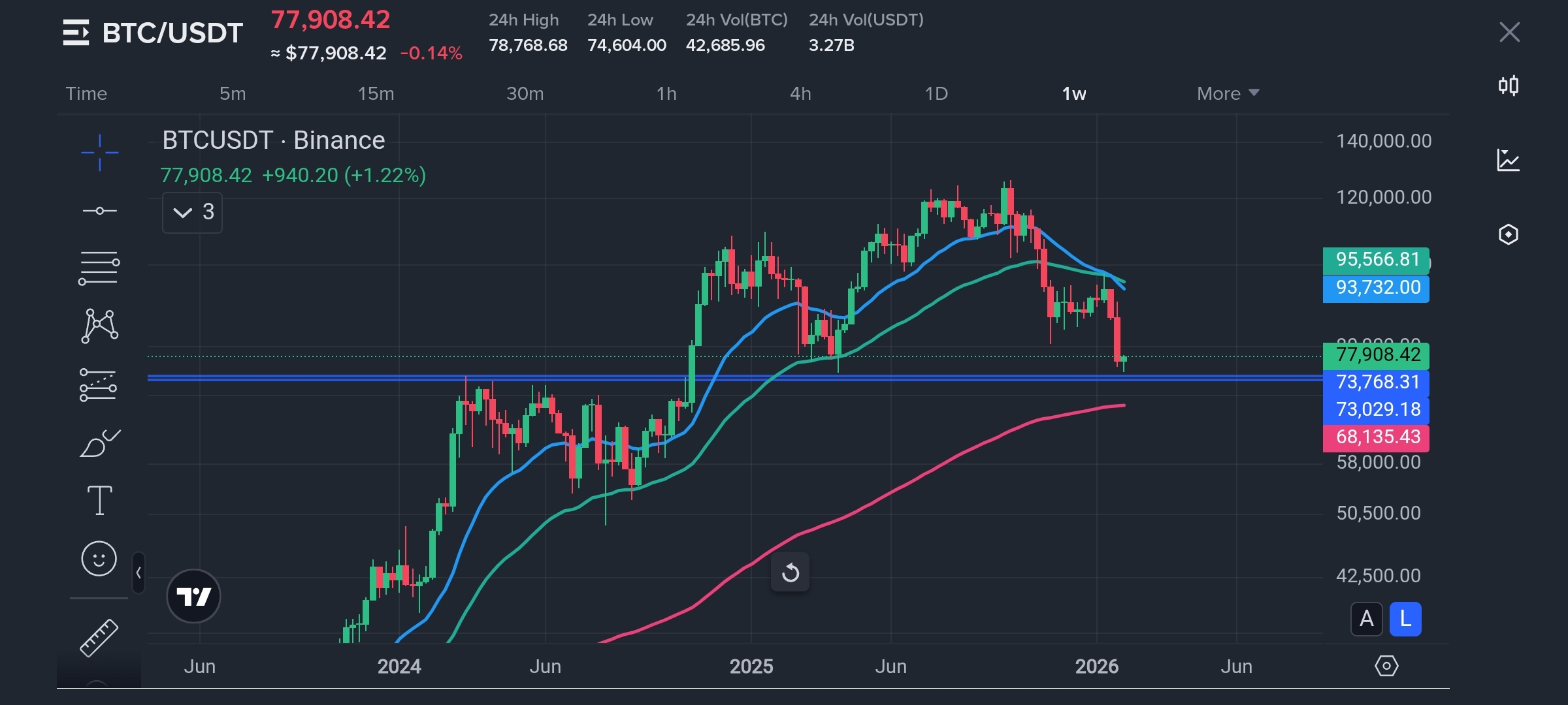 Bitcoin ponownie unosi się wokół poziomu, który stał się jedną z najważniejszych stref tego całego cyklu 73K – 74K.