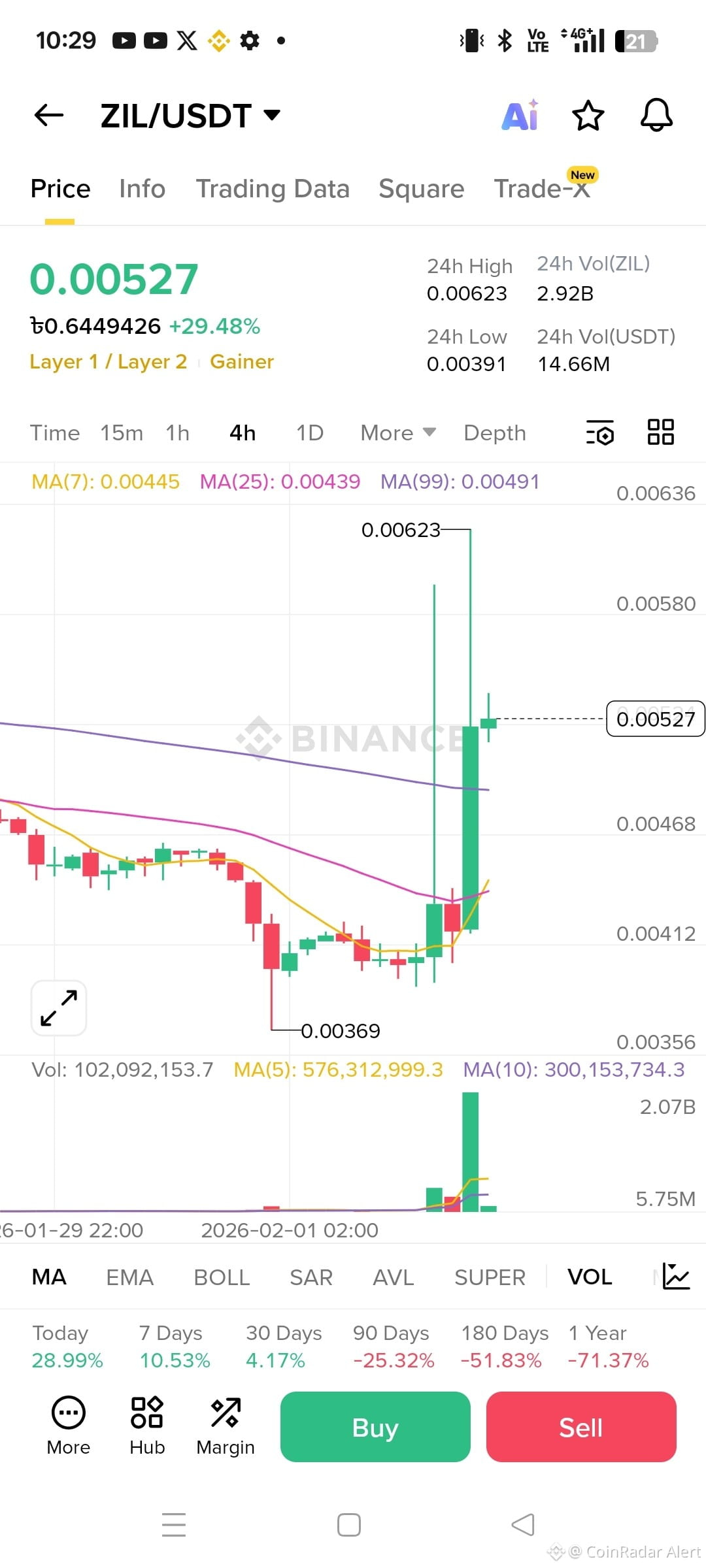 The $ZIL pair on the 4-hour chart continues to show that impressive breakout energy you spotted earlier, with the recent pump delivering around +29% (and some sources even showing spikes up to +50%+ in the last day or so depending on the exact timing). Volume has been exceptionally strong, which is a great sign that real conviction is behind this move rather than just thin air. Right now, the price is fluctuating in the broader 0.0052 – 0.0057 area based on live data from major trackers like CoinMarketCap, CoinGecko, and TradingView snapshots — it's been quite volatile with quick swings, but the overall structure still looks bullish after clearing previous resistance.