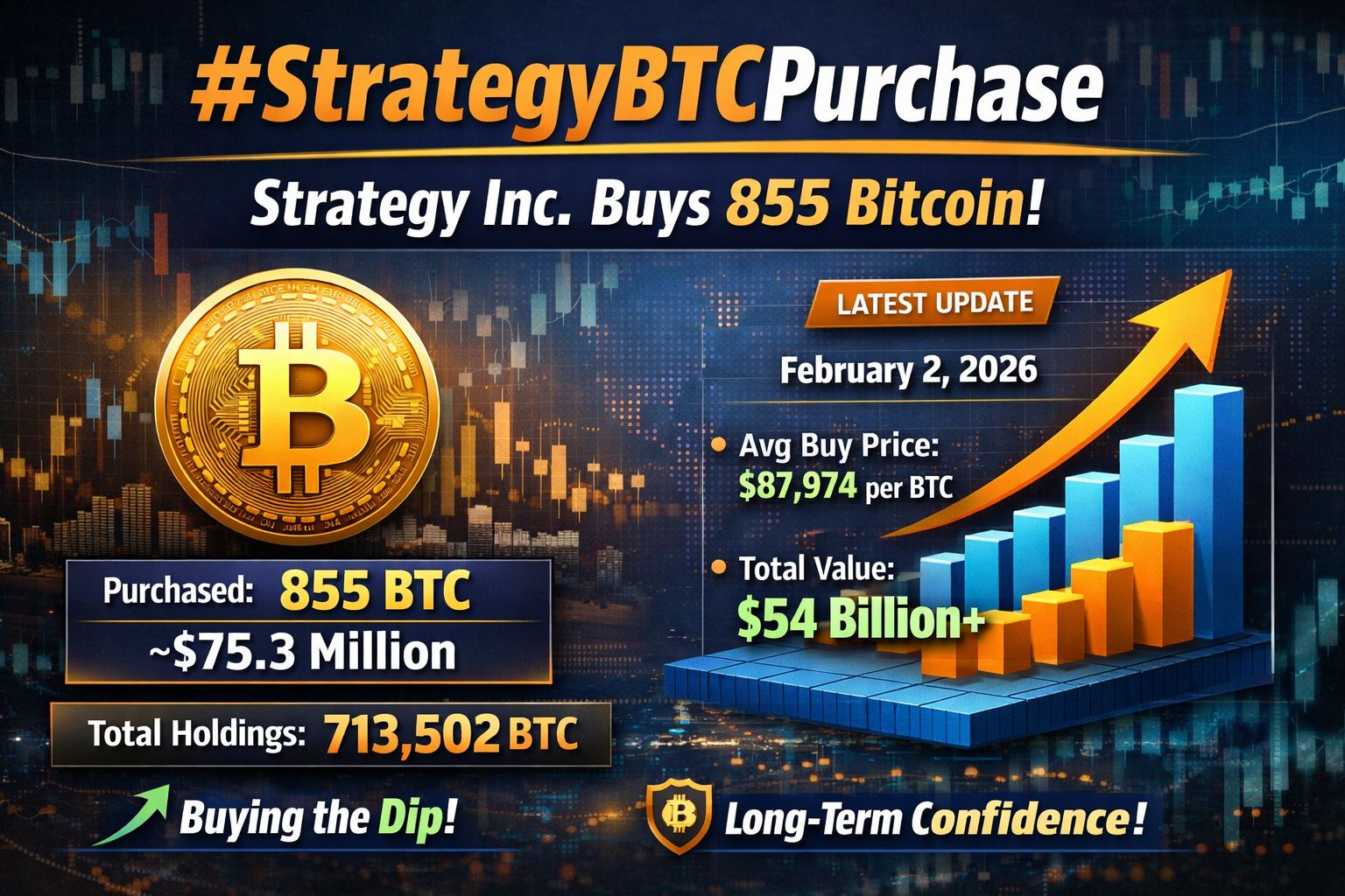 #StrategyBTCPurchase , corporate Bitcoin investor Strategy Inc. disclosed a new purchase of 855 Bitcoin (BTC), spending approximately $75.3 million to add to its massive crypto treasury. With this latest acquisition, Strategy’s total Bitcoin holdings now stand at 713,502 BTC, representing one of the largest corporate Bitcoin reserves in the world.