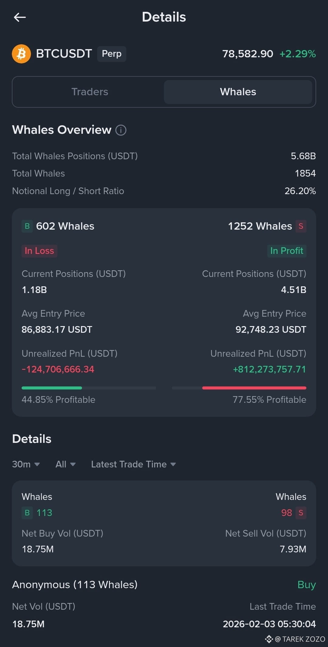 📌 মানে: অনেক long whale উপরে দামে ঢুকেছিল। এখনকার দাম (78k) তাদের entry (86k) থেকে কম → তাই বেশিরভাগ লসে।