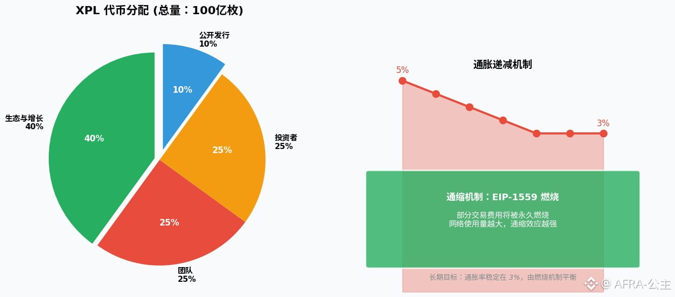 XPL 是 Plasma 的原生代币,总供应量固定为 100 亿枚。它的设计体现了"幕后英雄"的哲学——普通用户转账 USDT 时甚至不需要持有 XPL,但它却支撑着整个网络的运转。