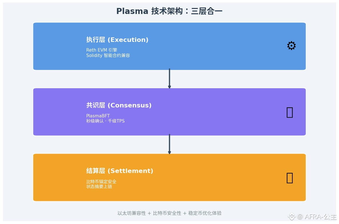 共识层(PlasmaBFT):这是 Plasma 的速度秘诀。PlasmaBFT 基于 Fast HotStuff 算法,通过"流水线"设计让区块提案、投票、确认三个阶段并行处理,而不是串行等待。结果就是:每秒可处理数千笔交易,确认时间不到一秒。即便三分之一的验证节点离线或作恶,网络依然安全运行。