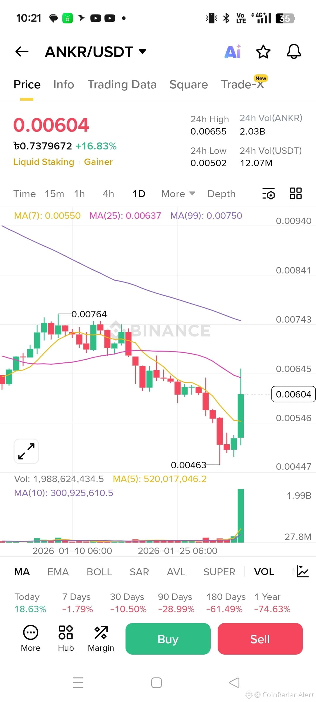 $ANKR is having one of those “wake up and choose violence” sessions. Price is sitting around 0.006004, up +16.83% on the day after ripping from roughly 0.00502 to a peak near 0.00655. The thing that really jumps off the chart is the ridiculous volume burst — that ~1.99B ANKR bar towers over the recent averages (MA(5) / MA(10)), which is usually what you see when momentum traders pile in and short-term sentiment flips hard.
