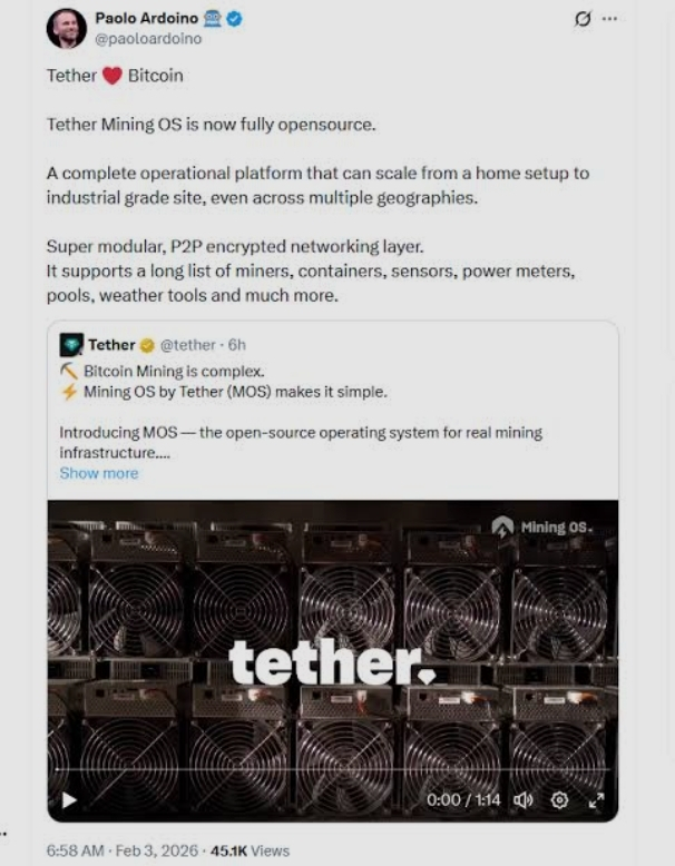 Tether Holdings Limited объявила о запуске полностью открытой системы майнинга Bitcoin ($BTC ) под названием Tether Mining OS (MOS). Паоло Ардоино, генеральный директор Tether, объявил, что MOS - это платформа нового поколения для полного производства, которая демократизирует индустрию майнинга Биткоина.