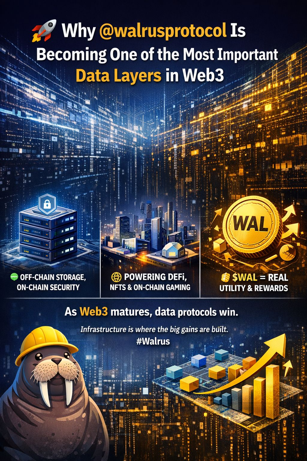 @Walrus 🦭/acc walrusprotocol cicho pozycjonuje się jako rdzeniowa zdecentralizowana warstwa danych dla następnej fali aplikacji Web3. W miarę jak DeFi, NFT i gry na łańcuchu rosną, dane stają się prawdziwym wąskim gardłem — a Walrus Protocol został stworzony, aby rozwiązać ten konkretny problem.