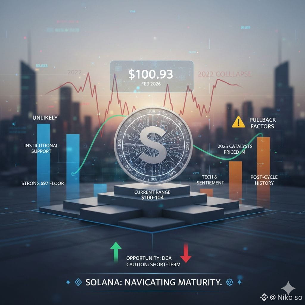 Solana ($SOL) is once again at the center of market debate. As of February 2026, SOL has retraced over 5% from its 2025 peak near $106, currently trading in the $100–$104 range (latest around $100.93).