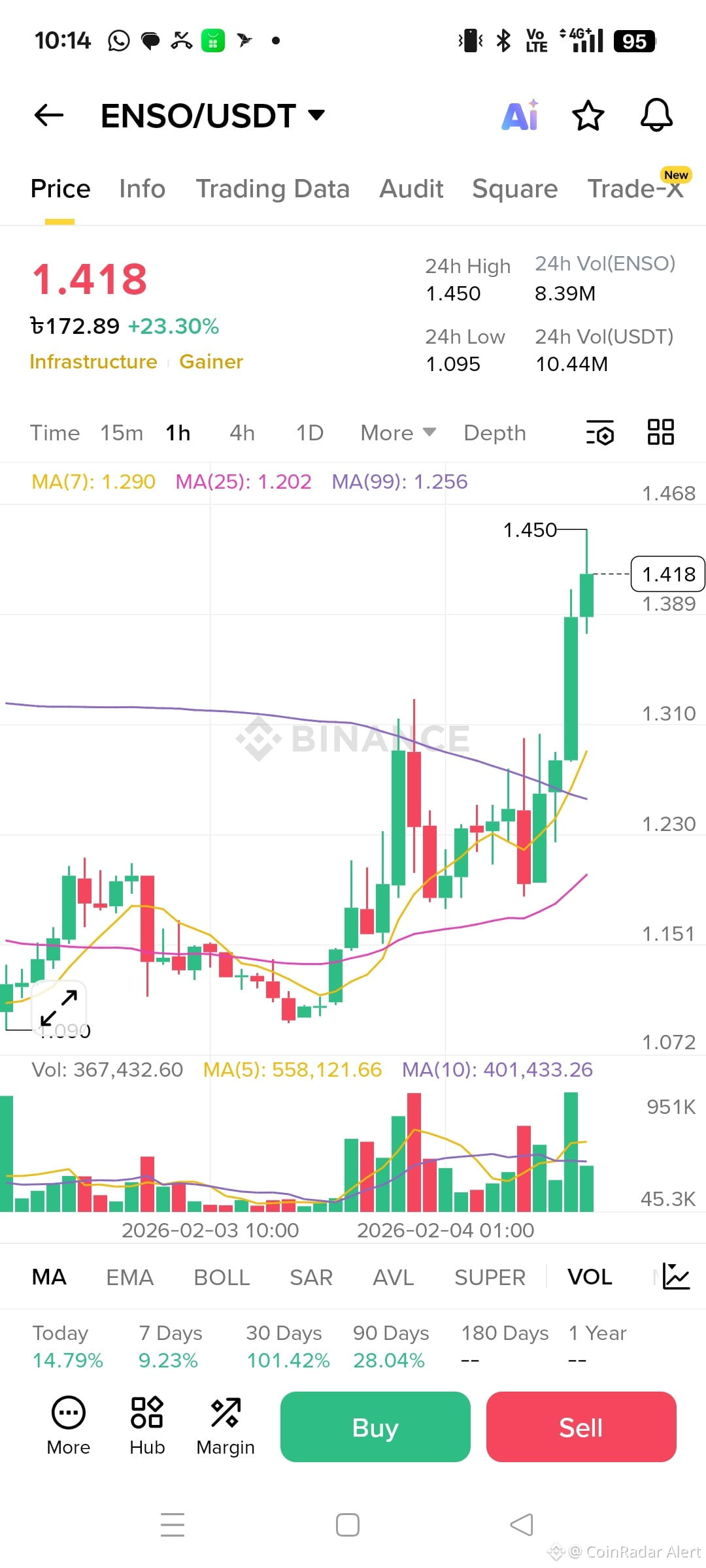 $ENSO on Binance is absolutely ripping today (Feb 4, 2026, ~10:15 AM +06). Price is sitting around 1.418 USDT, up roughly +23% in the last 24 hours after running from about 1.095 to a high near 1.450, and the volume looks legitâabout 8.3M ENSO traded (â 10.4M USDT). Itâs even tagged as an âInfrastructure Gainer,â which fits the Enso narrative as a cross-chain unification layer focused on shortcuts, intent execution, and shared stateâstrong theme for builders and AI agents.