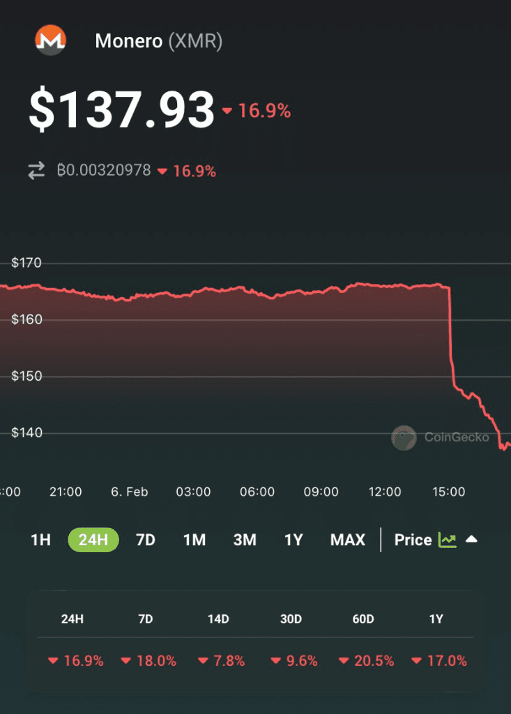 Wiadomość ta natychmiast spowodowała awarię cen XMR. Według witryny danych kryptowalut CoinGecko, XMR spadł o 16,9% po ogłoszeniu Binance, spadając do 137,93 USD. Od tego czasu wartość monety zapewniającej prywatność spadła jeszcze bardziej, a najnowsze aktualizacje cen pokazują, że XMR wynosi 114,20 USD.