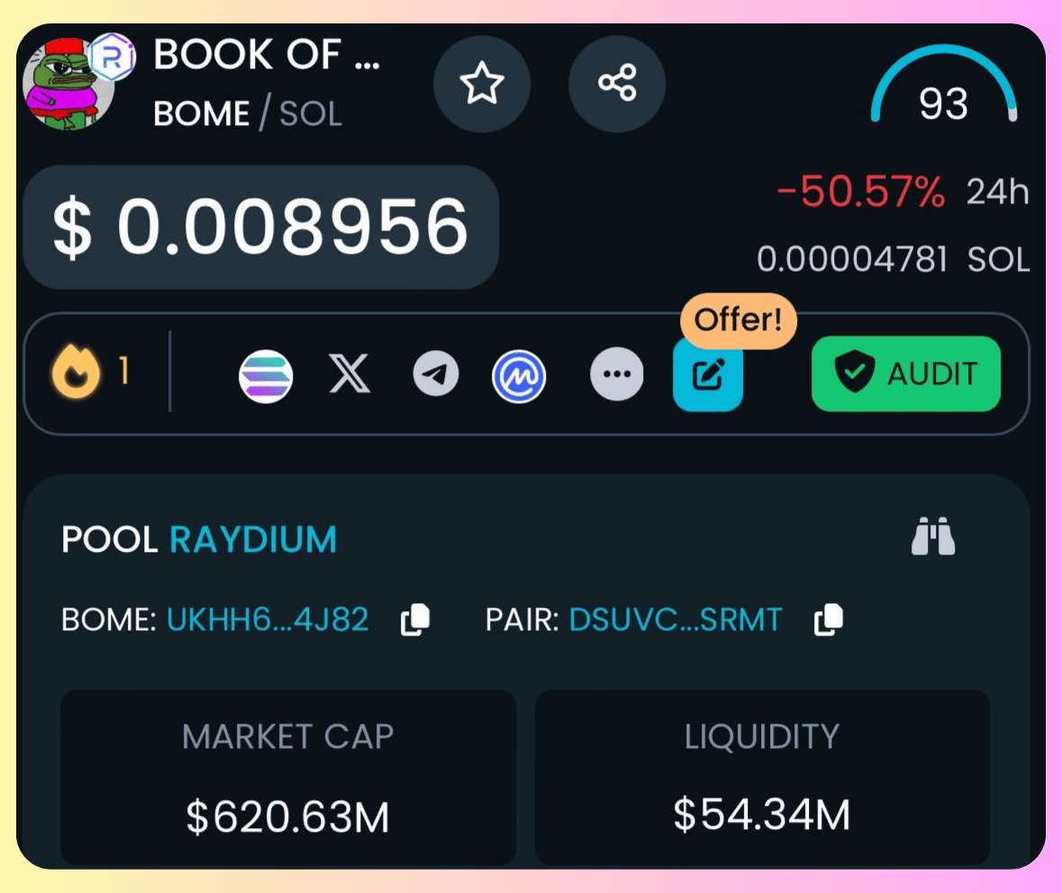 19 marca Po godzinie 9:00 największy holding BOME pod adresem sundayfunday.sol ponownie sprzedał 340 milionów tokenów BOME, zarabiając łącznie 18 660 SOL, przy średniej cenie sprzedaży wynoszącej 0,0107 USD i zysku 3,62 mln USD; pod adresem nadal znajduje się 900 milionów tokenów, ze względu na gwałtowny spadek ceny BOME, jego aktywa skurczyły się do 8,38 miliona dolarów.