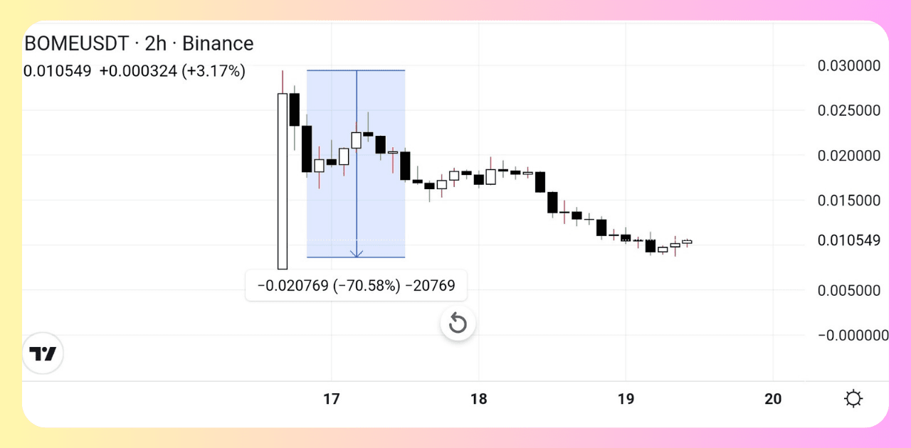 BOME spadło teraz o 70% z ich wysokiego notowania na Binance. Moneta stale spada i co godzinę tworzy pełną czerwoną świecę. Biorąc pod uwagę, że najlepsi posiadacze rezerwują swoje zyski i pojawiają się nowe memy, nadal jest to opcja zakupu