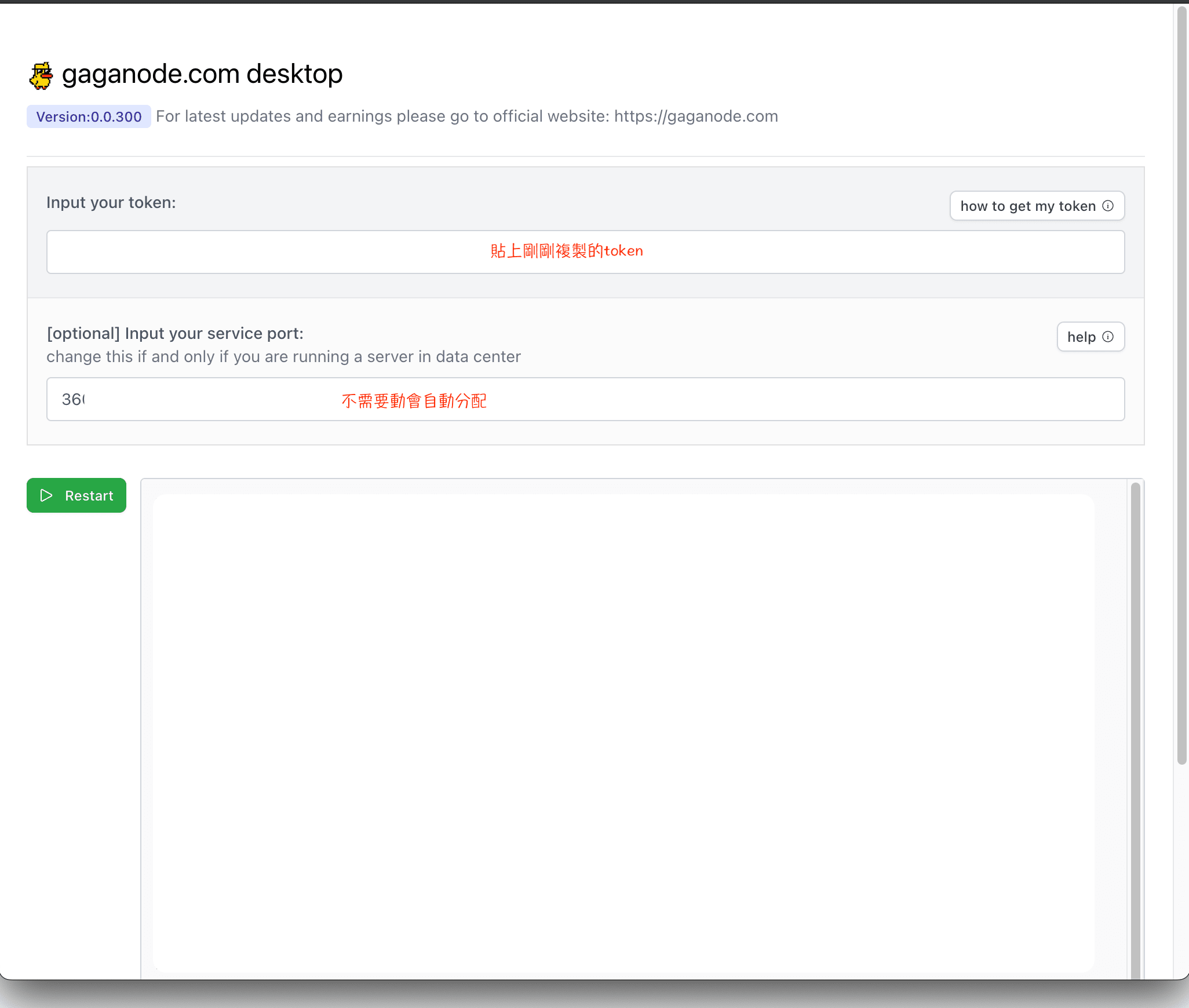 5. Po pobraniu i zainstalowaniu wklej skopiowany w kroku 4 token w polu tokena i naciśnij zielony przycisk ponownego uruchomienia poniżej.