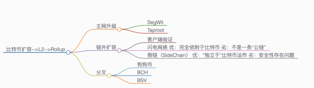 W procesie rozwoju Bitcoina od dawna istniały trzy praktyczne metody ekspansji. Najniższy poziom to aktualizacje sieci głównej, takie jak SegWit i Taproot. Drugi to ekspansja poza łańcuchem, taka jak weryfikacja klienta, sieć błyskawiczna i łańcuchy boczne. Wreszcie istnieją bezpośrednie forki, takie jak Dogecoin, BSV i BCH.