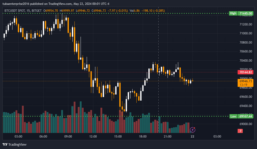 pokazujący zmiany cen Bitcoina w krótkim okresie w dniu 22 maja 2024 r. Oto szczegółowa analiza wykresu: